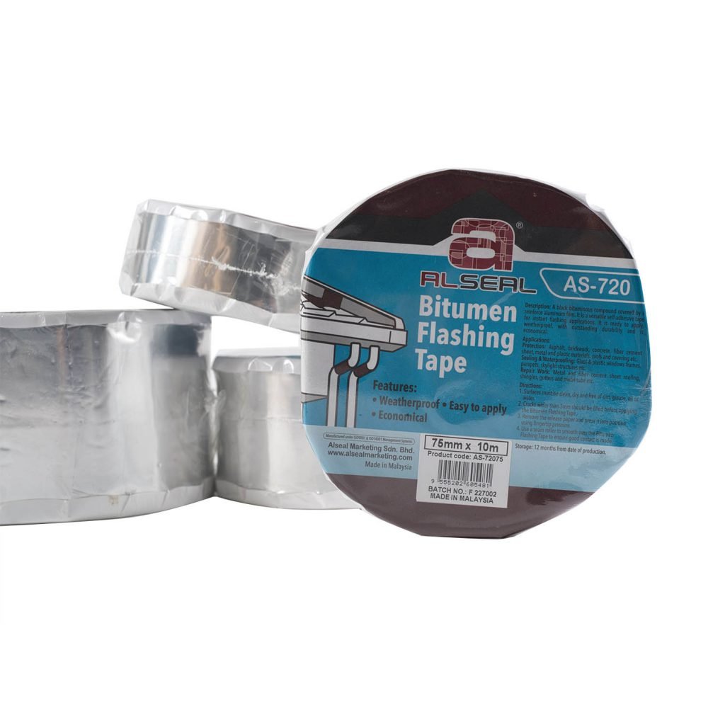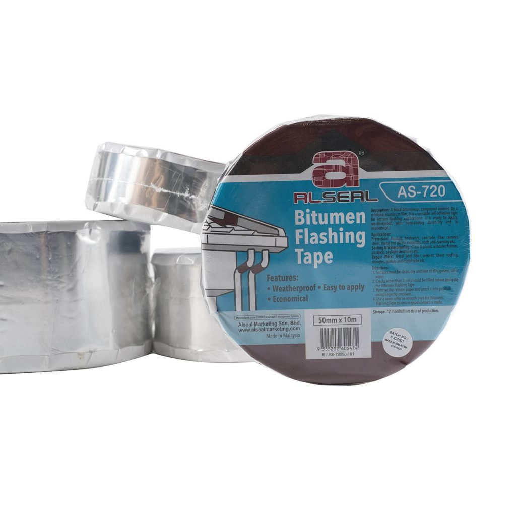 ALSEAL Bitumen Flashing Tape is a black bituminous compound consisting of a self-adhesive polymer-modified bitumen layer coated onto a tough high-density polyethylene film and covered by an aluminum foil.